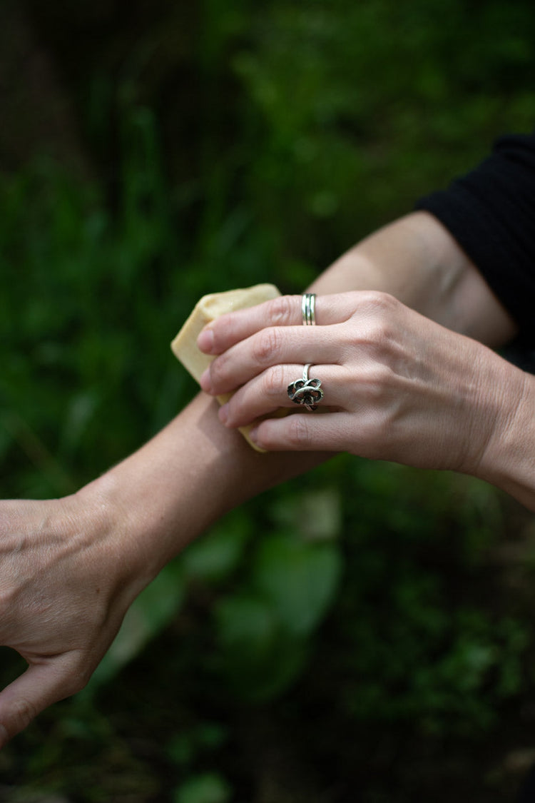 This bar can be used to massage directly onto the skin, or warmed between hands with a lathering motion. You may also choose to scoop a small amount from the bar with a tool or the back of your fingernail. Demeter stays solid at room temperature and melts with body heat. Store in a dry place, away from moisture and exposed to open air.