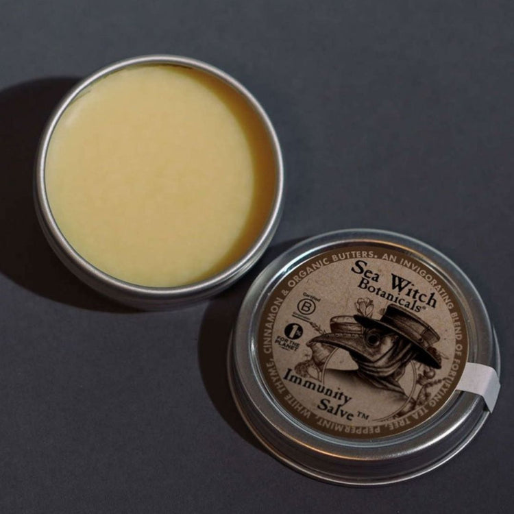 Featuring Eucalyptus, White Thyme, Clove, Orange, and Cinnamon. Immunity salve should be applied to pulse points like the wrist and just under the ear.