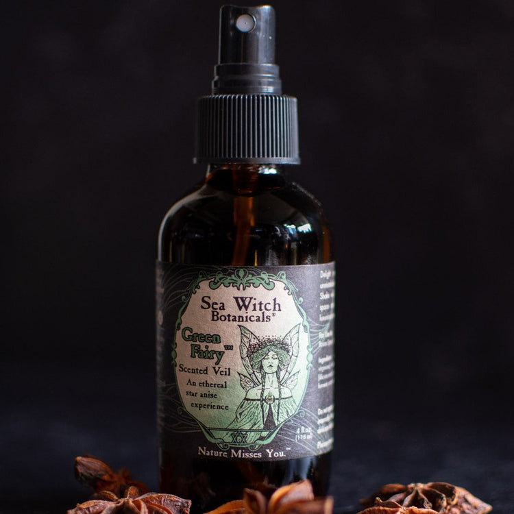 Dare to dance with the Green Fairy when you release this sultry, sweet and spirited scented veil. The star of the show is star anise, the little seed pod with a powerful scent and flavor! So powerful, it's used in production of absinthe to make its bitter wormwood more palatable. Take the adventurous aura of the Green Fairy with you as a perfume, or deploy her around the home as an all-natural air, linen, garment, and dryer spray.