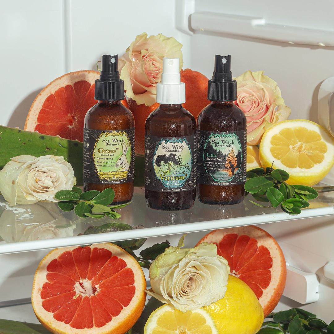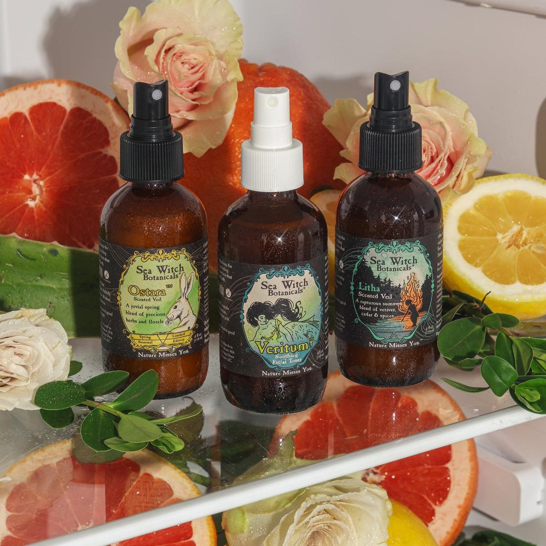 These three all-natural, water-and-witch-hazel-based mists include one spray bottle apiece of Ostara Scented Veil, Litha Scented Veil, and Veritum Soothing Facial Toner, all at a 15% discount together while supplies last.