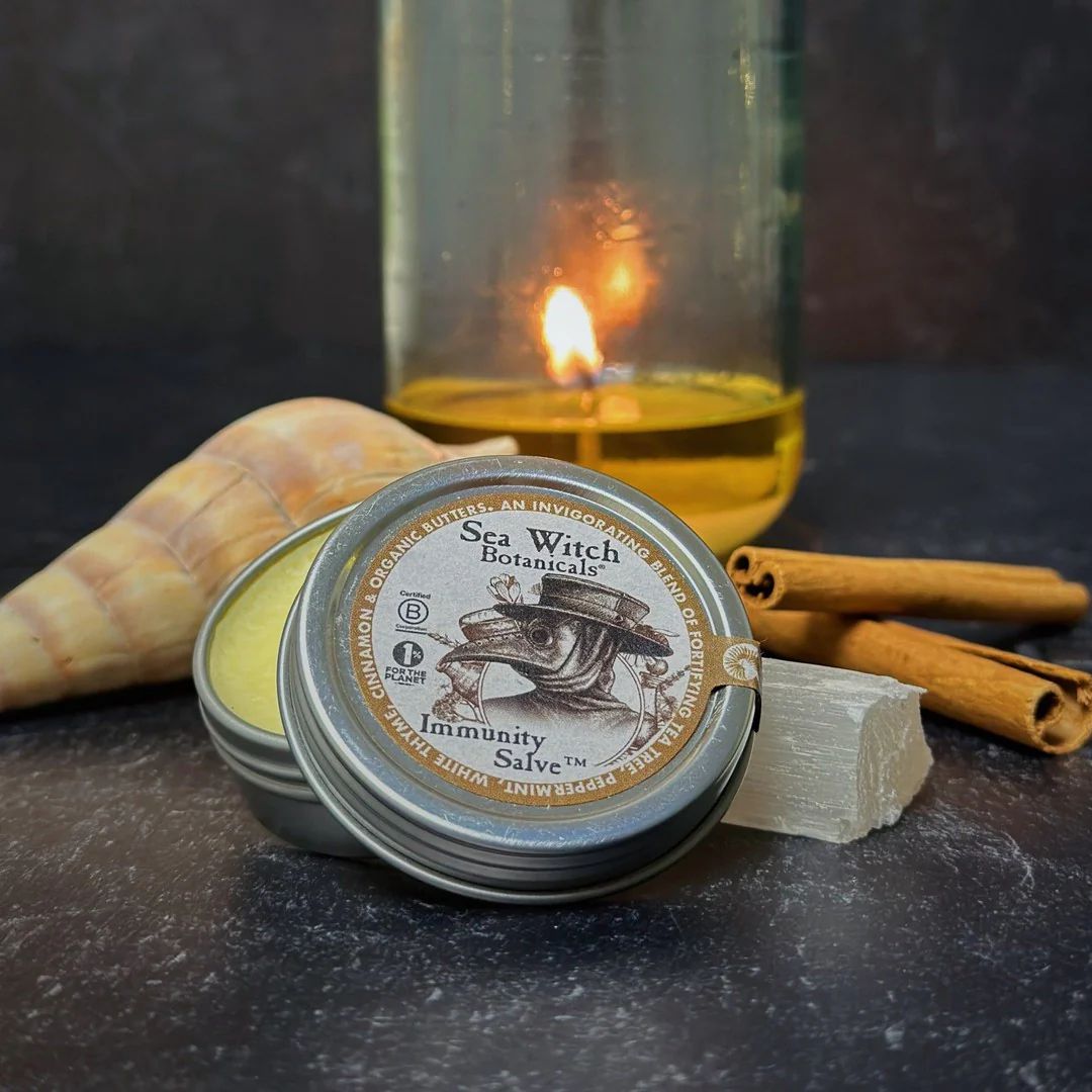 This fortifying blend of essential oils is great for everyday use. Based on the "thieves of the black plague" lore, this ancient array of herbs was said to protect those who wore it from the black death. Apply this salve - rich with Eucalyptus, White Thyme, and spices, to your pulse points during cold & flu season.