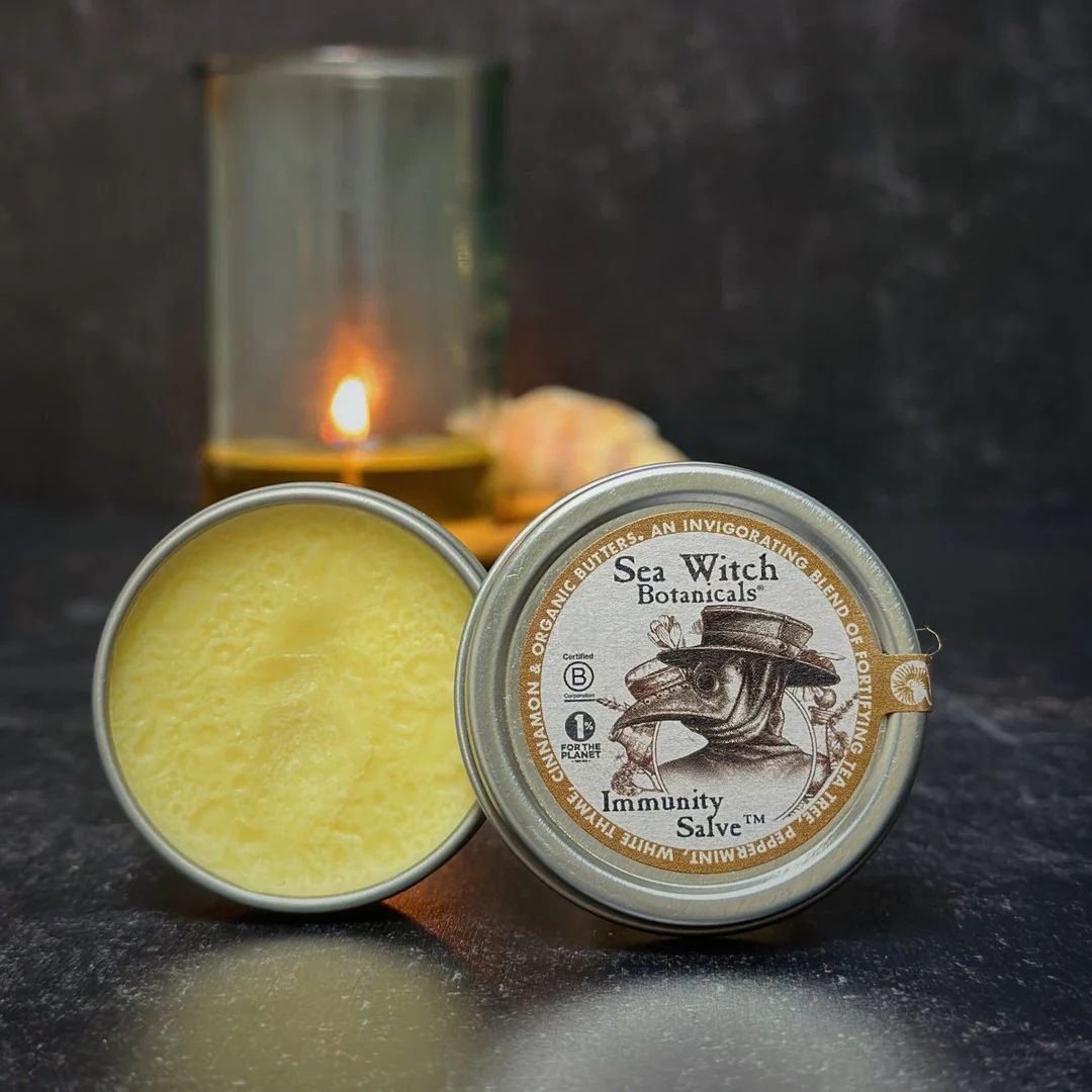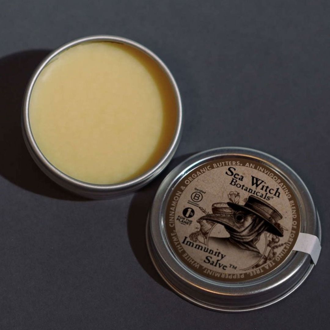 Featuring Eucalyptus, White Thyme, Clove, Orange, and Cinnamon. Immunity salve should be applied to pulse points like the wrist and just under the ear.